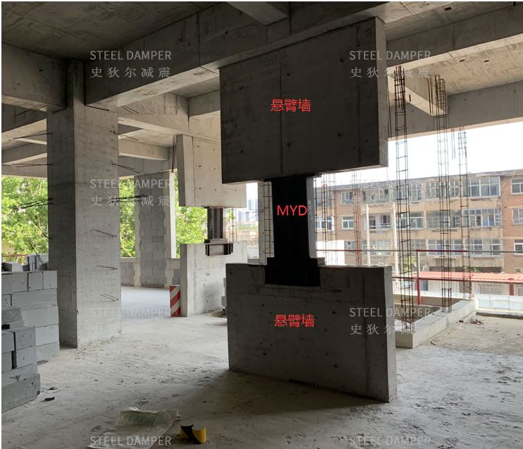 Wall connection: set a piece on the upper and lower two floors of the main structural beam concrete cantilever wall, the cantilever wall (lower) and the upper (lower) beam are rigidly connected, (upper) embedded parts and connector plates (or steel members), damping The device is welded by buried connecting plates (steel members), and connected with the cantilever wall by bolt connection.